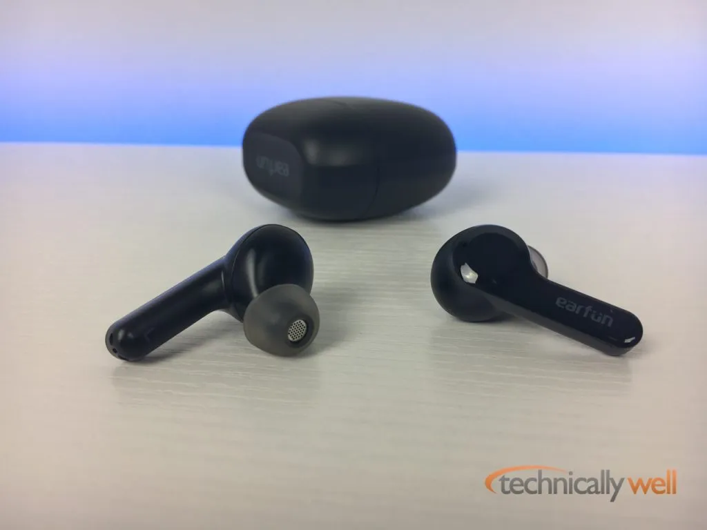 The EarFun Air wireless earbuds somewhat resemble the AirPods with their stem that extends down from your ear. Like the EarFun Free, they do not have any around-the-ear hooks or stabilizer tabs to help hold them in place, so they may not be ideal for intense workouts. However, they are comfortable to wear even for long periods and would be ideal for work or chores around the house.