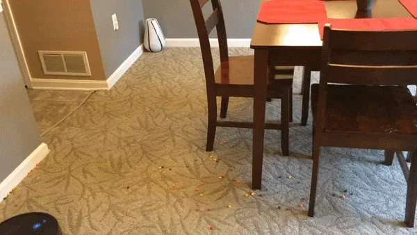 Check out my “Skittles test” in my review video below. After 30 minutes of vacuuming, the Eufy missed some Skittles around the chairs and along the wall. By comparison, the Roomba seemed to maneuver around the furniture a little better to collect more Skittles, but still missed the Skittles along the wall.