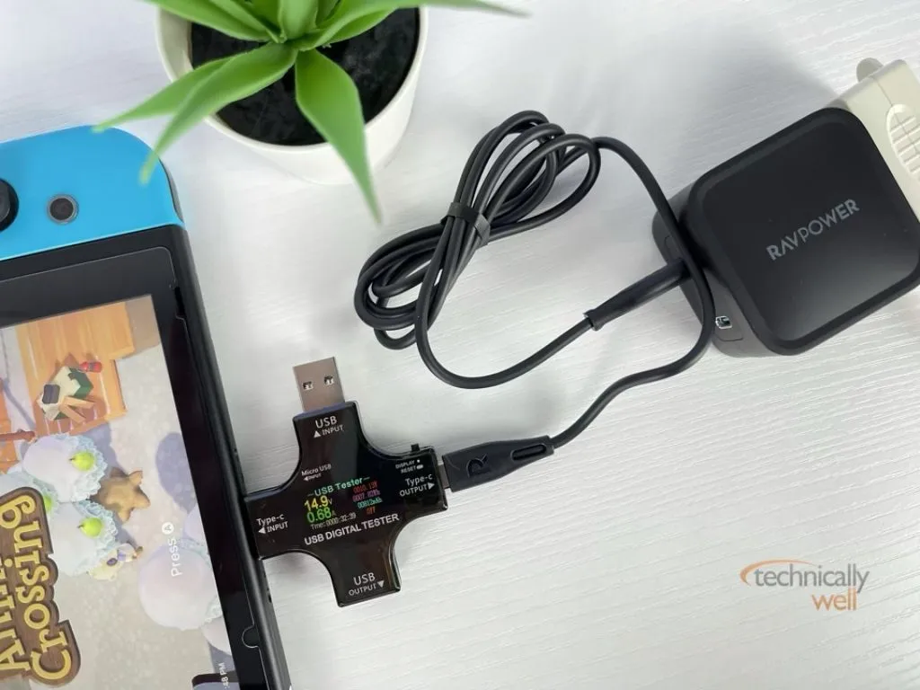 The RAVPower PD wall charger successfully supported the Nintendo Switch’s 15V charging profile, allowing you to play in handheld mode and charge at the same time.