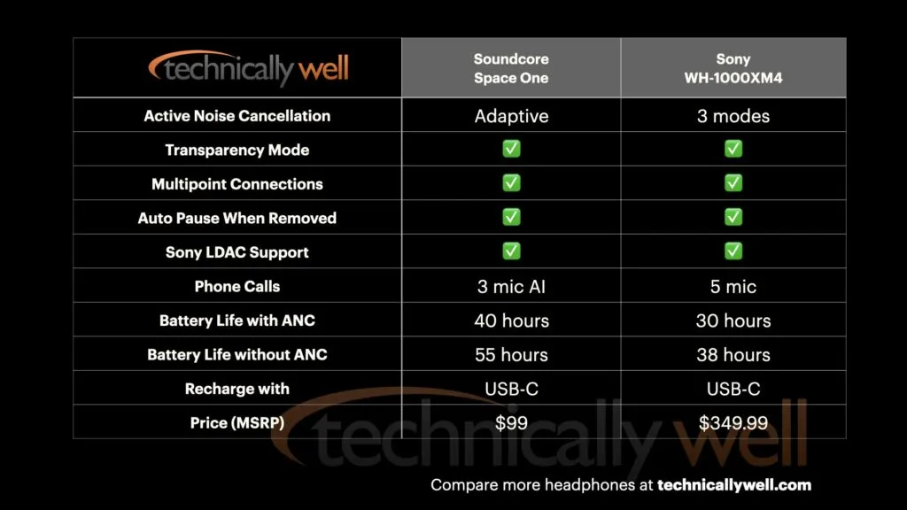 When comparing the Soundcore Space One to the popular Sony WH-1000XM4, you can find that you get most of the features and longer battery life. The Space One may have fewer microphones for phone calls, but calls still sound fine.